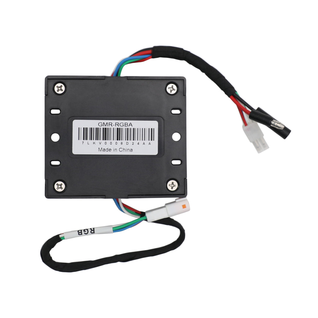 The GMR-RGBA has a simple four-plug connection. Connect the GMR-RGBA to the GMR-7V1 (sold separately) via the male JST connector to the female JST connector on the GMR-7V1 labeled 'RGB'. Provide 12V power/ground to the GMR-RGBA via the bullet connectors, and additional RGB lighting is added via the four wire RGB Plug. |