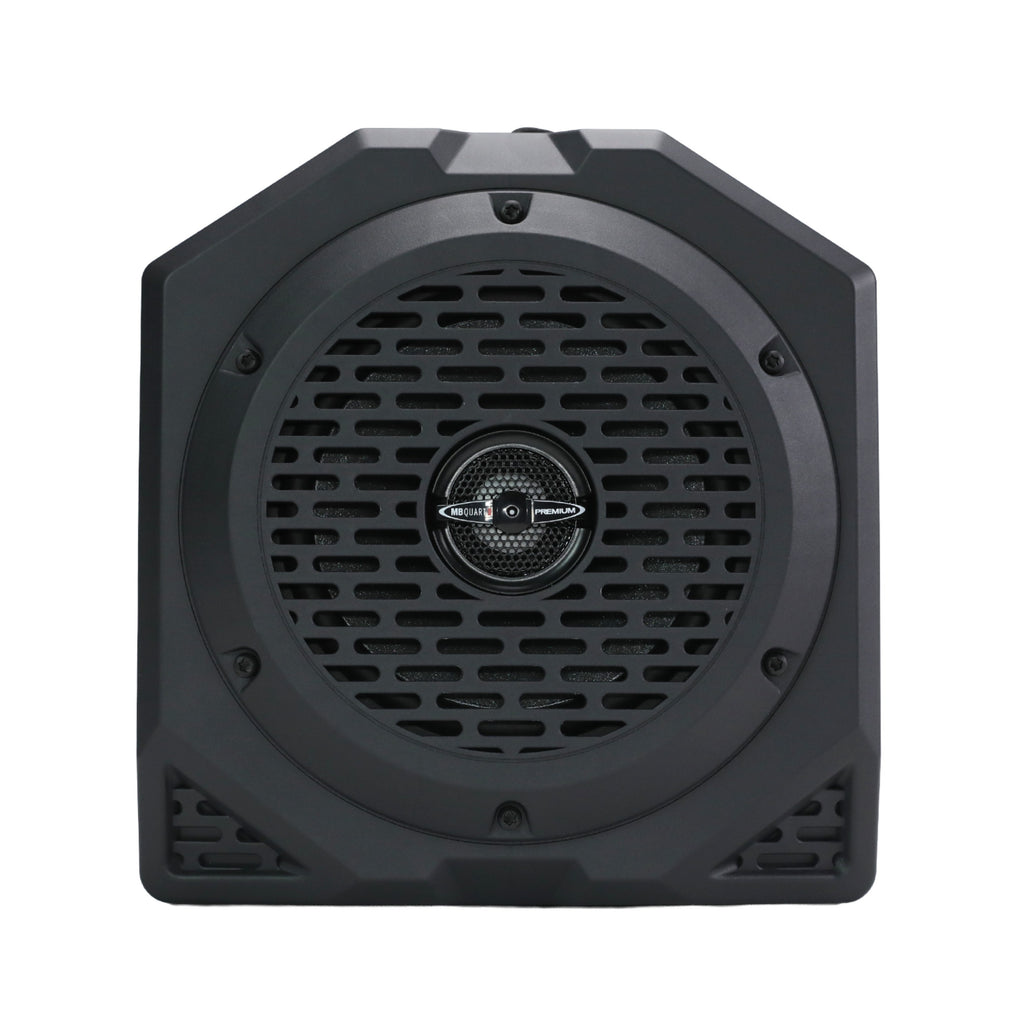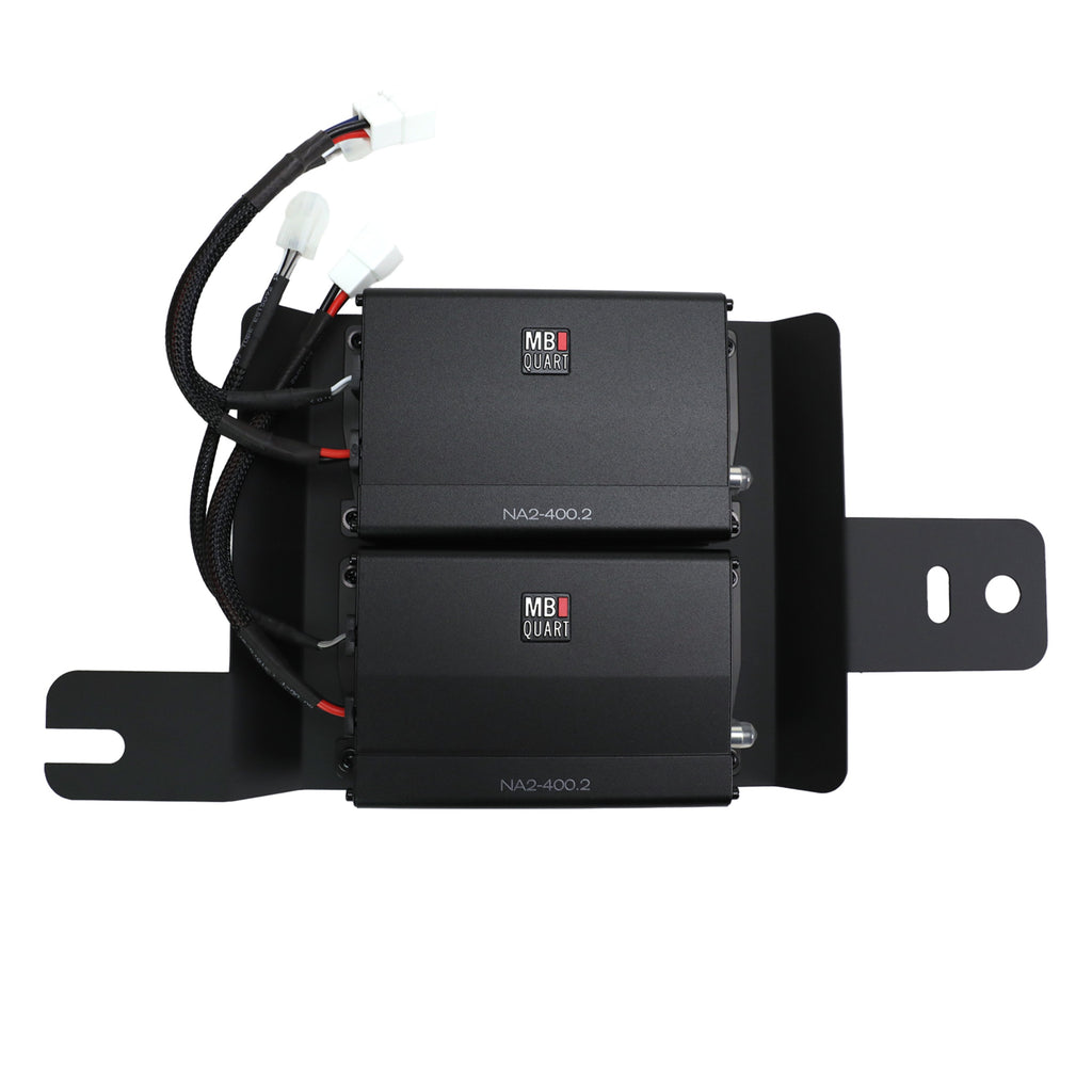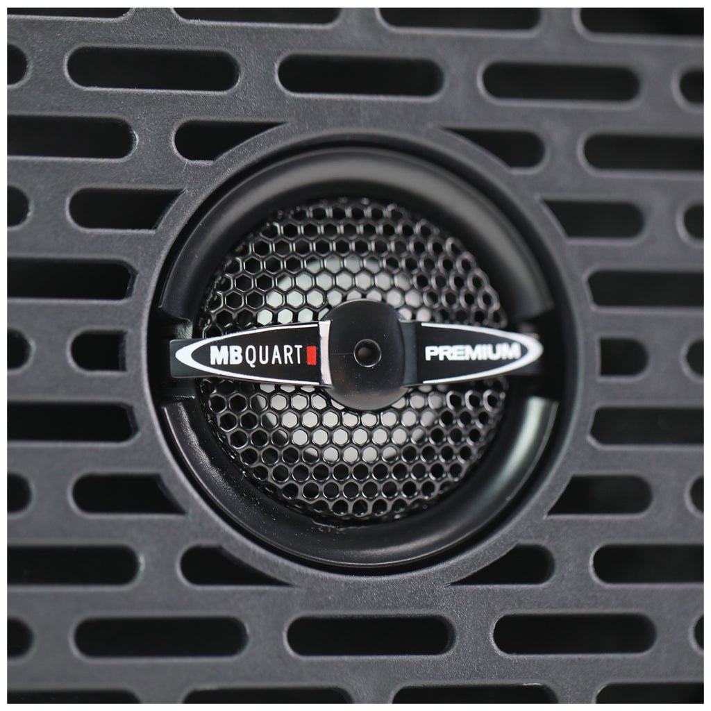 MB Quart MBQBRO-STG6A-1-25 800 watt eight speaker STAGE 6 audio system with 6.5 inch 3-way front component speaker system, two 6.5 inch 2-way coaxial speaker pods, and powered by two 400 watt 2-channel Class-D amplifiers. Requires the OEM B&O audio system. (Raptor Trims require the additional purchase of MBQBRO-RAPB rear speaker brackets)