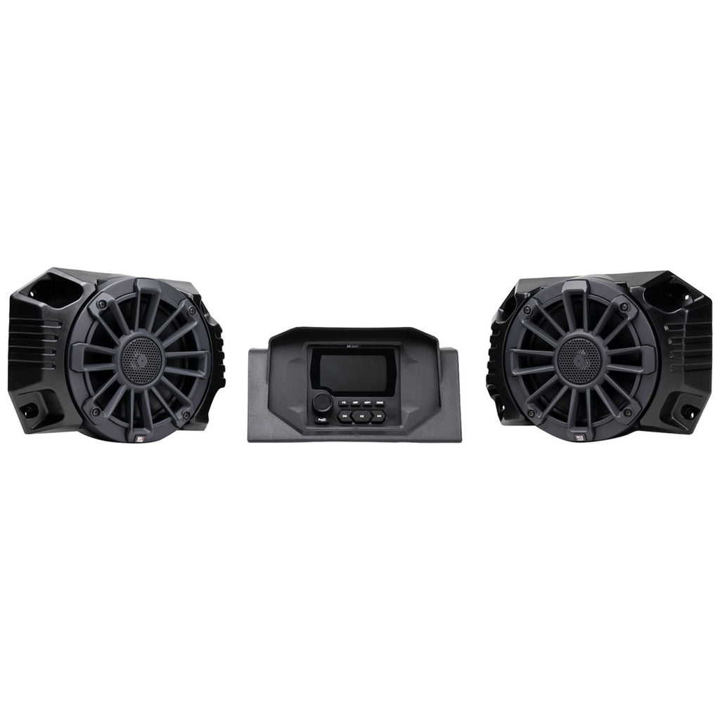 Polaris RANGER 2018-Current UTV Tuned Audio Package: Two Speaker 400 Watt STAGE 2 Audio System designed to integrate into the vehicle’s RIDE COMMAND source unit to control the system which includes one amplifier powering 2 coaxial speakers. Dash speaker grilles for 2018-2024 & 2025-current RANGER models, along with all necessary mounting hardware and wiring, are included.