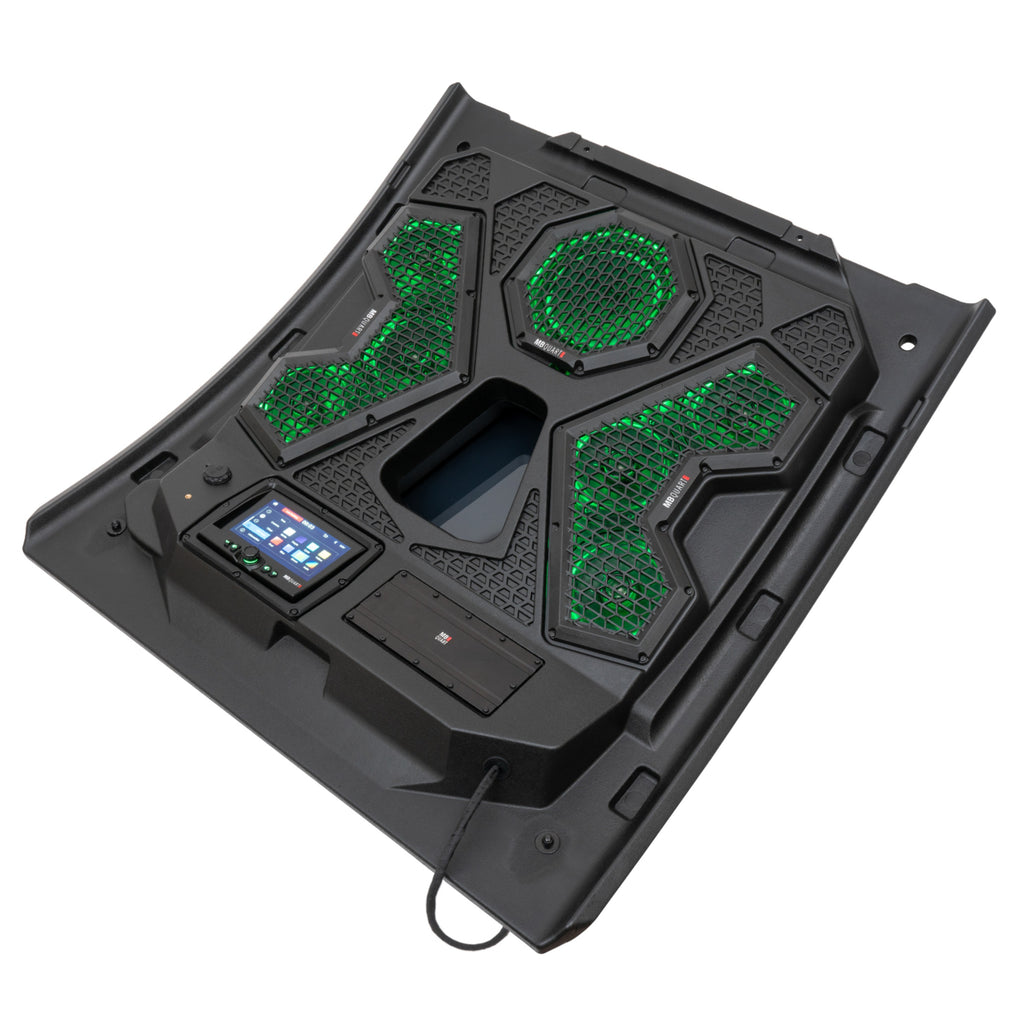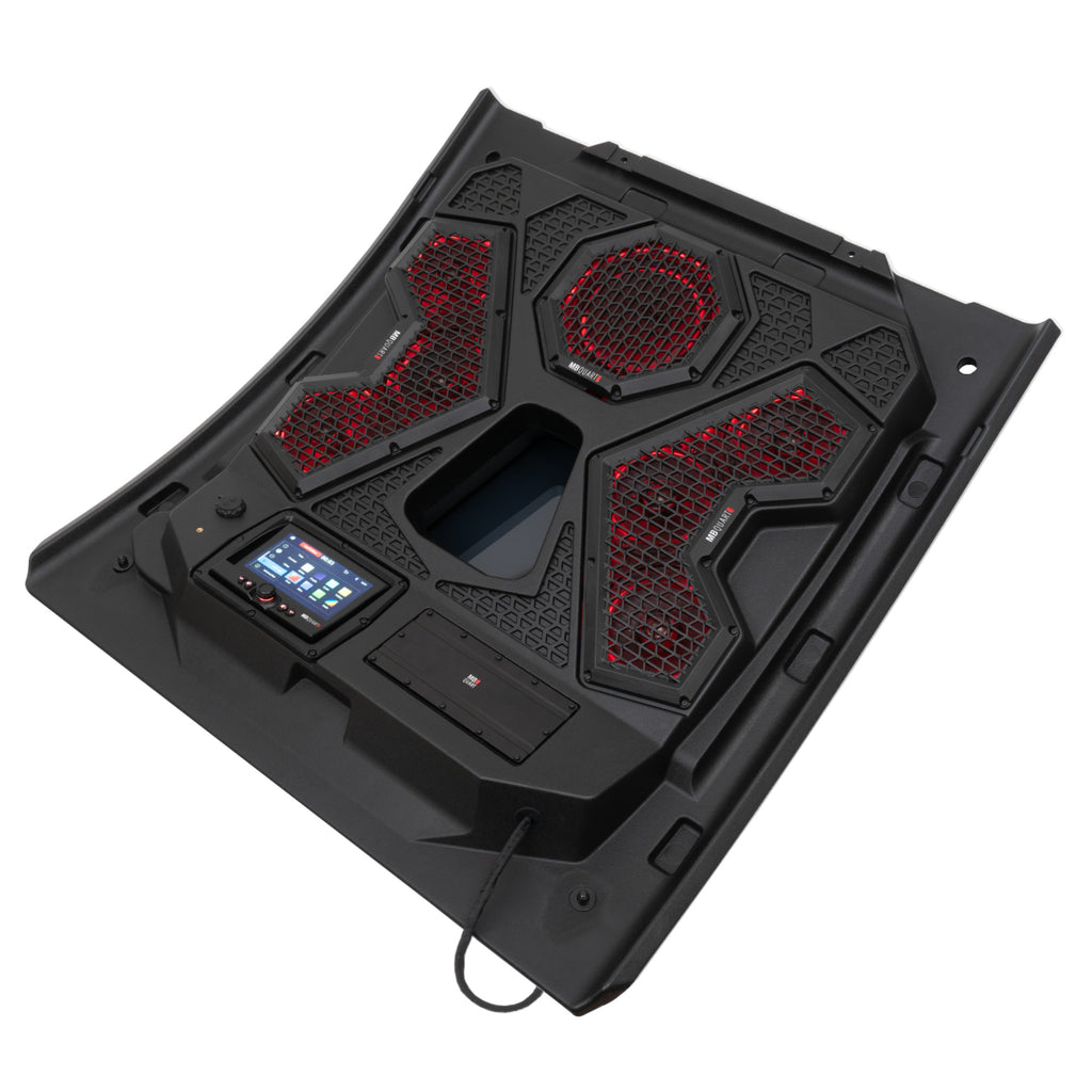 MB Quart MBQRT2-S7R 500 watt, 7 speaker audio roof with a GMR7V1 touchscreen CarPlay source unit. It features six powersports-specific 6.5 inch coaxial speakers, a 10 inch powersports-specific subwoofer, a 500 watt 5-channel Class-D amplifier, and a 32 inch half-optic light bar.