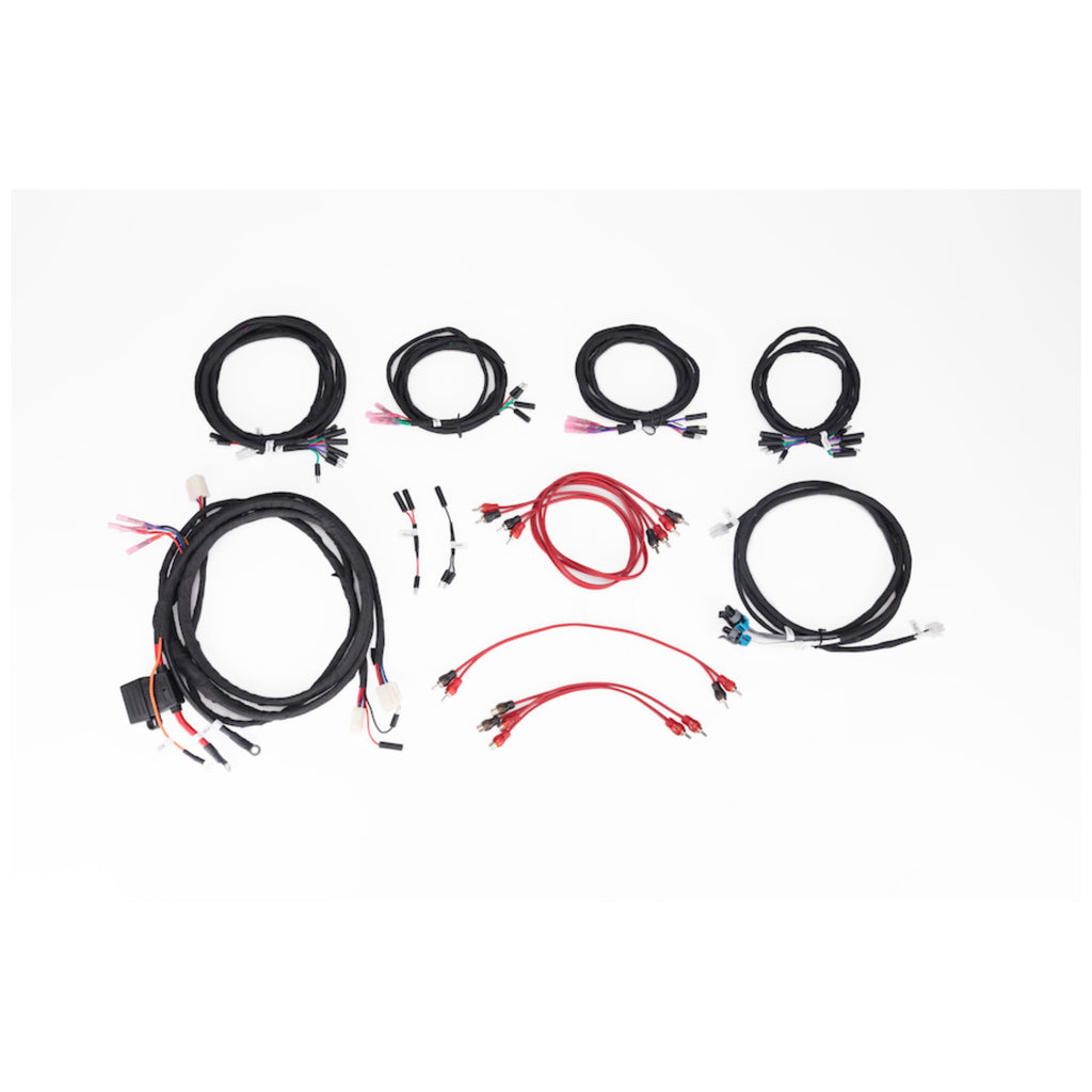 Full system harness capable of accommodating source unit, 3 amplifiers, which power 4 speakers, and 2 subwoofers.
