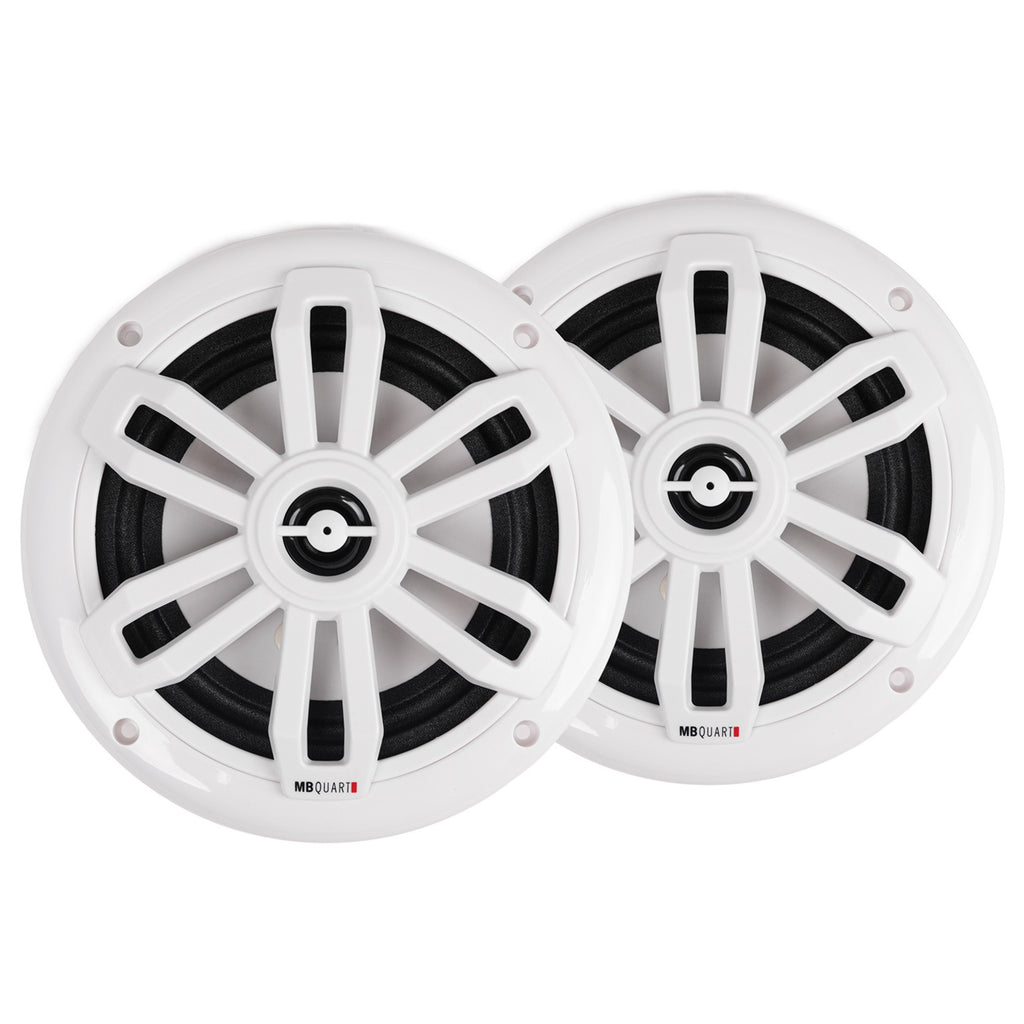 MB Quart NF1-116SW Nautic ultra compact waterproof marine certified, 6.5 inch coaxial speaker for boat, RV and off-road vehicle audio installations. These speakers feature water resistant midrange cones, crystal clear tweeters and rust resistant connectors. Sold in pairs with grills in white.