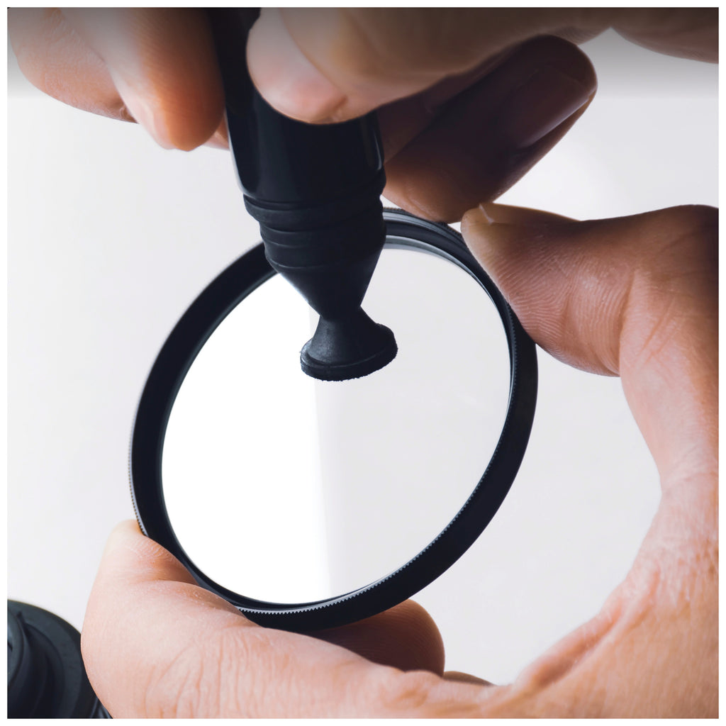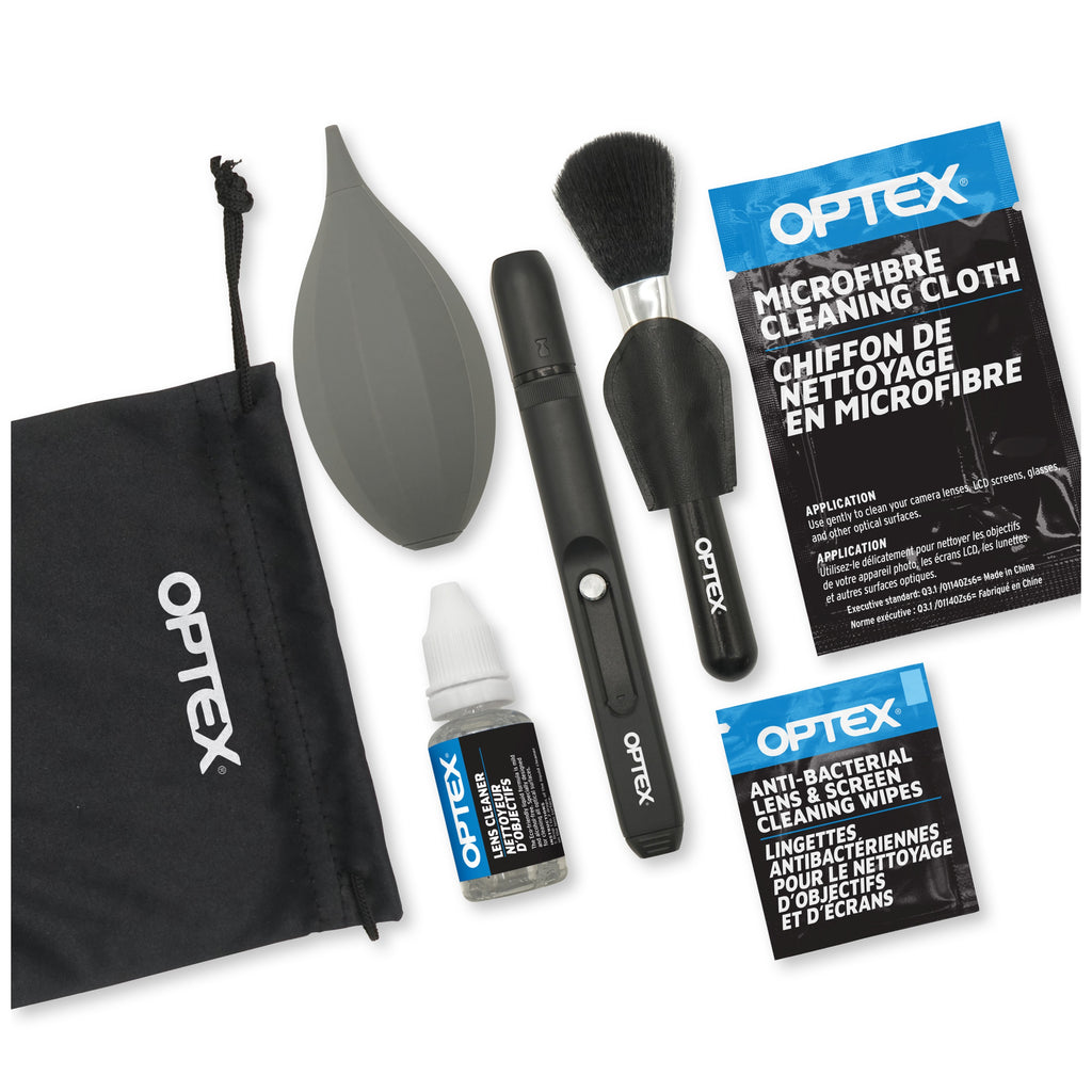 Kit Includes lens cleaning pen, air blower, liquid lens cleaning solution, dust cleaning brush, wet lens wipes, microfiber cleaning cloth, and carry bag